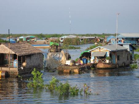 Da das Boot schon um sieben in der Früh ablegte, stand ich schon um 5:30 auf. Wir fuhren eine schmale Asphaltstrasse Richtung Süden auf dem Boeng Tonle Sap, den größten See Südostasiens, zu. Entlang des Weges floss ein Bach. Eine Frau hatte ein kleines Schiff mit Kerzen in der Hand und ließ es zu Wasser. Viele solcher Kunstwerke trieben den Bach hinunter. Ich fragte Phat nach deren Bedeutung. Er meinte, dass wahrscheinlich jemand gestorben sein. Die Vorstellung drückte mir eine Träne in die Augen. Am Ende der Strasse war ein kleiner Berg, an dessen Fuß eine Siedlung zu erkennen war. Ich musste kurz halten, um dem wunderschönen Sonnenaufgang zu fotografieren. Wir waren an der Anlegestelle des Schnellbootes angekommen. Eine etwas 30m lange und 4 m Breite Blechzigarre sollte mein Boot sein. Mädchen verkauften Baguettes, Eckerlkäse und Bananen an die Leute, die zum Boot wollten. Ich deckte mich mit den Angebotenen ein und bestieg das Boot. Der Blechkarren bot in seinem Inneren Sitzplätze an. Da ich aber die Aussicht genießen wollte, bestieg ich das Dach des Bootes und nahm unter einem kleinen Dachvorsprung des Kapitänstandes Platz. Nach und nach füllte sich das Boot und viele taten es mir gleich.