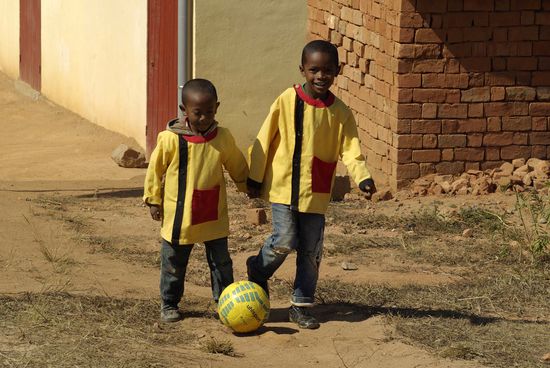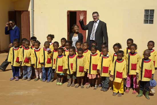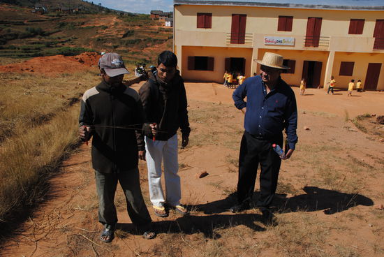Die Nacht ist kurz, um 9:00 Uhr ist Klaus K. mit seiner Frau zum Frühstück da. Die meisten von ihm bestellten Sachen sind noch mit meinem Gepäck unterwegs. Um 10:00 Uhr kommt Heri dazu, der Bruder von Prof. Dr. Mahefa. Wir machen uns auf den Weg zur Schule. Ich lasse Klaus den BMW fahren und darf dafür ans Steuer seines Toyota Landcruiser. Tsiresy hat vor ein paar Tagen mit der Lehrerin telefoniert und unser Kommen angekündigt. So sitzen alle 60 Kinder erwartungsvoll und brav an ihren Schulbänken, als wir in der Schule ankommen. Ich nehme die Kreide und schreibe an die Tafel: "Guten Tag. Mein Name ist Frank.". Die erste Lektion Deutsch. Dann werden die Mitbringsel ausgepackt. Die Lehrerin ist außer sich vor Freude, als sie Sabines altes Handy bekommt. Nun ist sie auch mit der restlichen Welt vernetzt. Strom dafür gibt ein kleines Solarpanel. Michael hat für die Erstklässler Schokolade und für die Zweitklässler Sonnenbrillen dabei. Und Jörg hat noch einen Beutel voll Traubenzuckerketten mitgebracht.