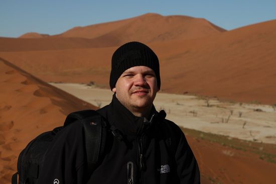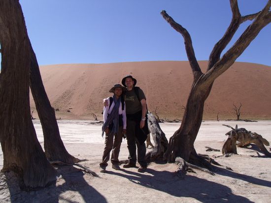 Pro Person macht das 80N$ +10N$ (10Namib $ = 1Euro)fuers Auto. Vom Gate aus sind es nochmal 63km bis zum Parkplatz vorm Vlei. Die letzten 4km darf man nur mit einem 4x4 zurueck legen. Selbst das wuerde ich aber nur erfahrenen Sandfahrern empfehlen. Ansonsten gibt es einen Shuttle fuer die letzten 4km die aber mit 100N$ pro Person reinhauen! Naja, wir mussten ihn nehmen und ich haette mich es selbst mit einem 4x4 nicht getraut. Am letzten Parkplatz angekommen musste man nochmal ca. 1km bis zum Deadvlei laufen. Und dann war er endlich da, so wie man ihn sich schon im Internet angeschaut- oder auch vorgestellt hat. Ich habe ca. 1,5-2 Stunden mit fotografieren verbracht- Danke fuer die Geduld an meine Frau