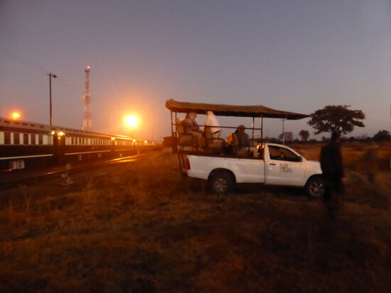 Ohne Frühstück, nur mit einer Tasse Kaffee aus eigener Produktion entsteigen wir um 6.00 Uhr am Restaurantwagen bei völliger Dunkelheit dem Zug. Sieben Jeeps stehen bereit, mit einer Flasche Wasser bestückt und nach Hinweis des Oberreiseleiters angezogen wie eine Zwiebel – es ist stolze 9 Grad Celsius – besteigen wir die Jeeps und hüllen uns in die bereitgestellten Wolldecken ein.