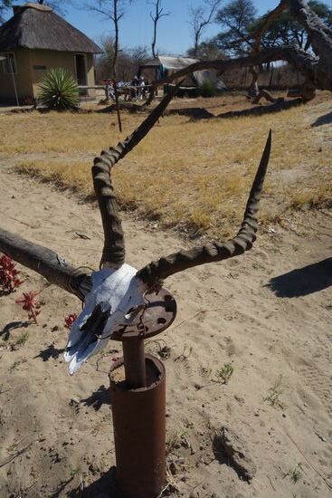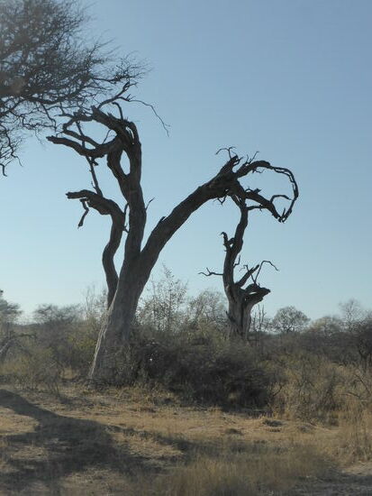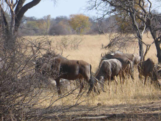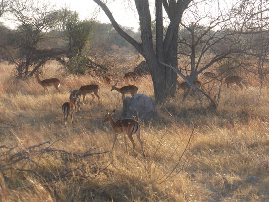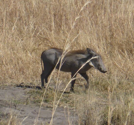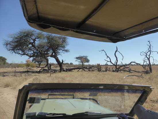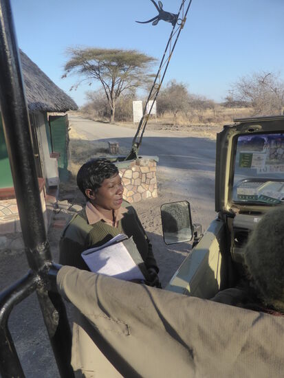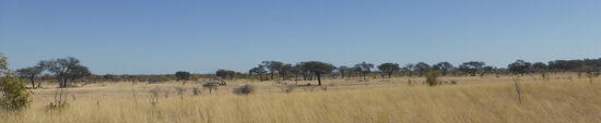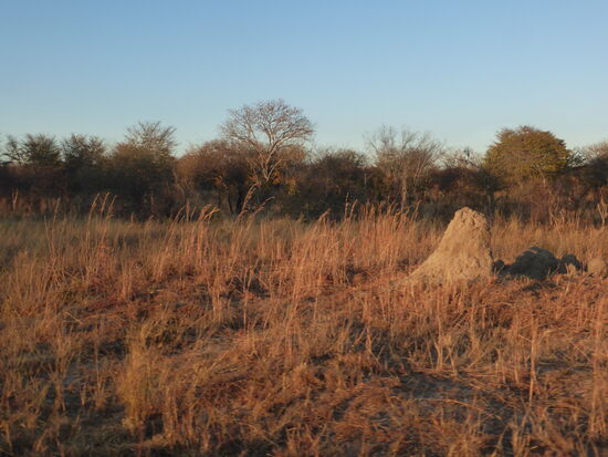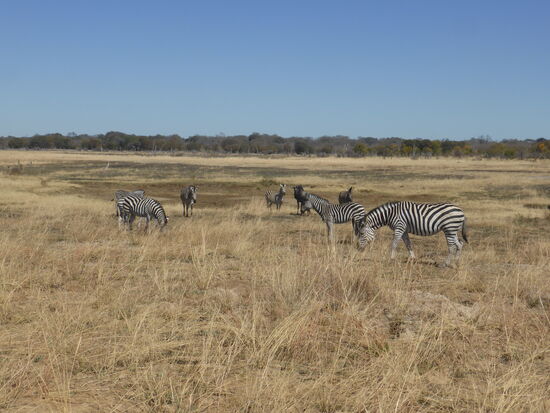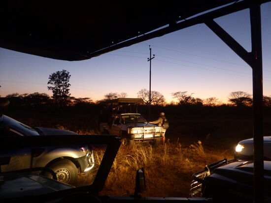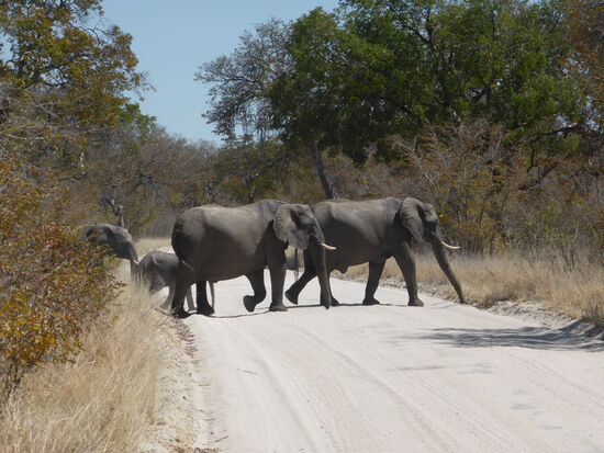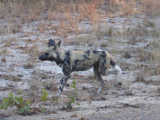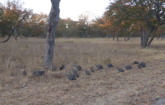 Etwa 10 km weiter überqueren wir dann die Bahnlinie und gelangen an eine erste Schranke des Hwrange Nationalparks. Es geht nichts über Bürokratie – unser Trek muß sich in ein Buch eintragen. 6 Kilometer befindet sich dann die nächste Schranke. Vorher sehen wir noch eine Großfamilie von einer Art Perlhühnern und zur Freude von Inge mehrere – ganz selten zu findende - Hyänenhunde. Die Fahrt durch die mich faszinierende Landschaft in der frühen Morgenstimmung wird nochmals unterbrochen, das erste Wild taucht auf. Am zweiten Gate das gleiche bürokratische Spielchen, das dann jedoch an der Rezeption des Parks noch getoppt wird: Alle tragen sich mit Unterschrift in ein Buch ein – linke und rechte Spalte – die mittlere muß beim Verlassen des Parks unterschrieben werden – natürlich hinter der richtigen Nummer – Namen sind nicht erforderlich!