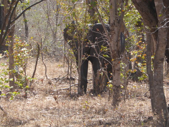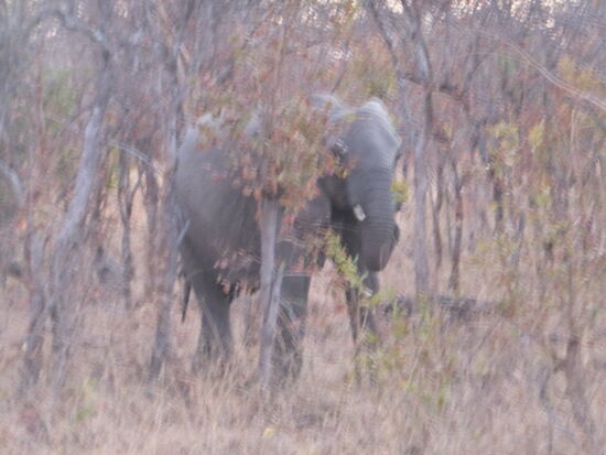 Da ein Aufschrei – Elefanten – in der Dämmerung tauchen sie zwischen den Bäumen auf. Trotz widriger Belichtung muß fotografiert werden.