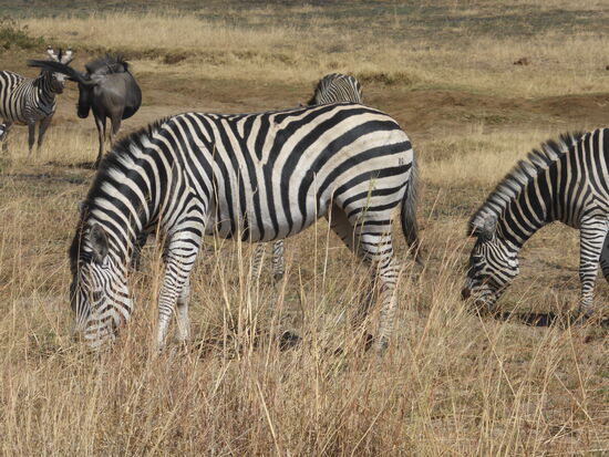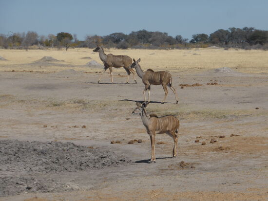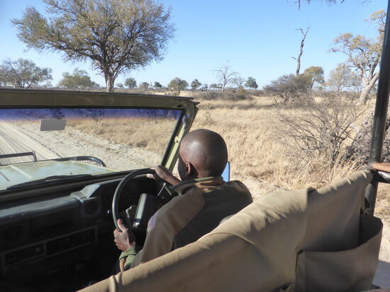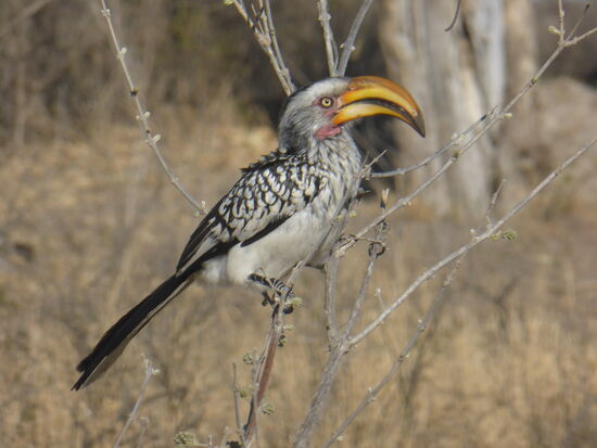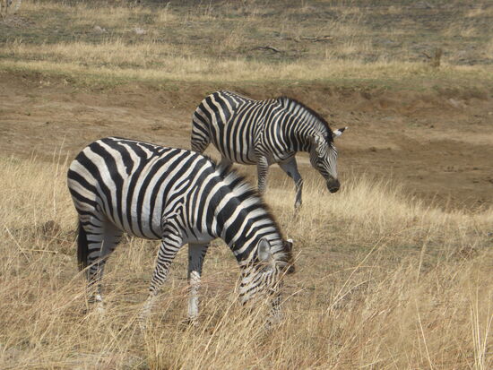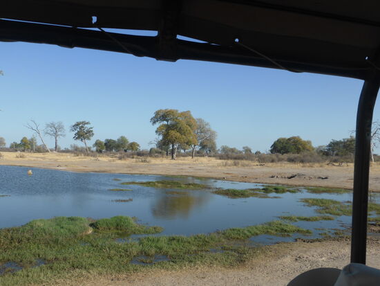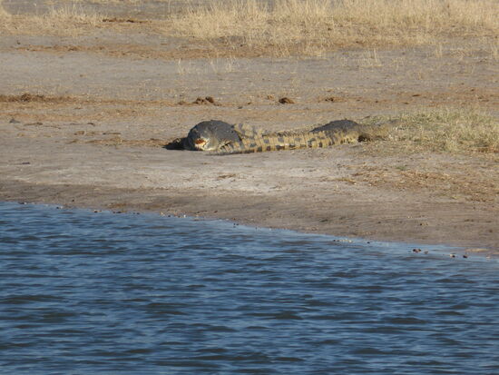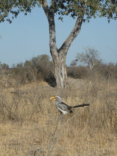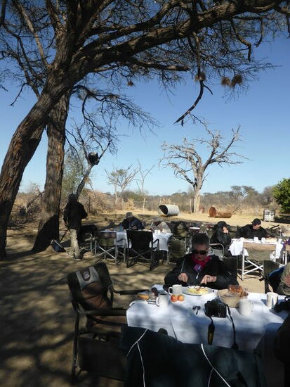 Zebras, Rehe, Krokodile, Bananenvogel, Büffel in herrlicher Landschaft durchsetzt mit zahlreichen Wasserlöchern, die jedoch merklich niedrigen Wasserspiegel haben, da es wohl seit Monaten nicht geregnet hat. Zum Teil hat man Solarpanels aufgebaut, um mittels Pumpen Grundwasser hochzuholen. Um 9.30 Uhr ist dann an einer abgezäunten Stelle das Frühstückspicknick aufgebaut.