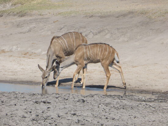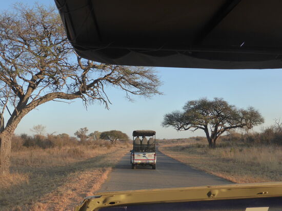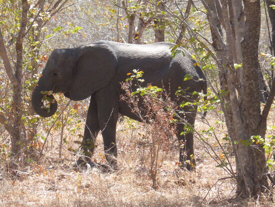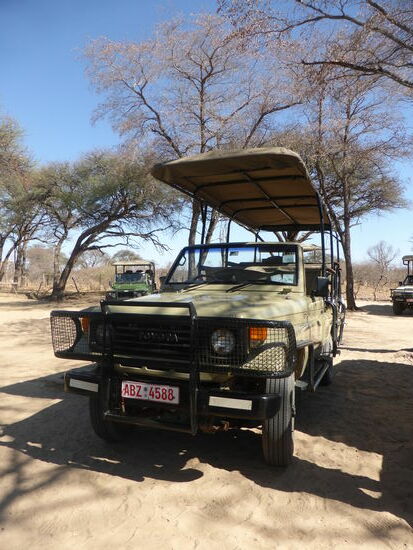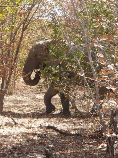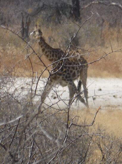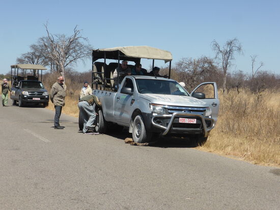Nach dem Frühstück geht es weiter, nun lassen sich auch die ersten Elefanten bei Tageslicht sehen. Später warten wir eine geraume Zeit darauf, dass sich die Giraffe aufrecht hinstellt. Kurz vor der Mittagspause hat dann eines unserer Fahrzeuge einen platten Reifen.