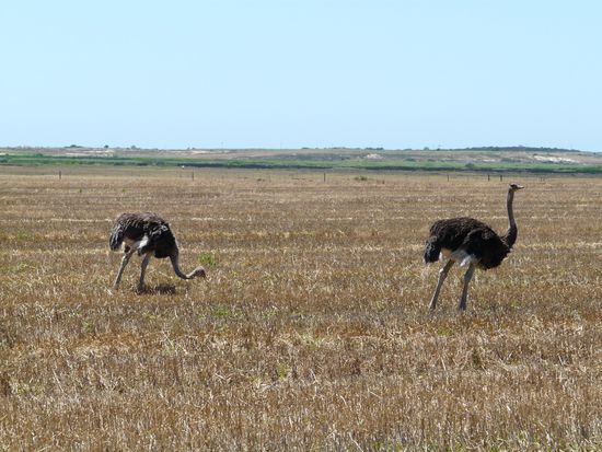 Waehrend unserer Weiterfahrt nach Cap Algulhas konnten wir die Gelaendetauglichkeit unseres Corsas testen. Von jetzt auf gleich endete die asphaltierte Strasse und wir befanden uns fuer lange Zeit nur noch auf Schotterpisten. Entlang der Pisten konnten wir verschiedene Tiere beobachten. Als erstes haben wir eine Schlange (wohl eine Puffotter), dann wilde Strausse und spaeter noch Zebras gesehen. Cap Algulhas ist der suedlichste Punkt Afrikas. Zudem treffen hier der Indische und der Atlantische Ozean aufeinander. Der Ort an sich ist nicht sonderlich spektakulaer. Besucher verirren sich hier hin nur um den suedlichsten Punkt gesehen zu haben und am Strand zu liegen. Wir sind nach einer kurzen Tour durch den Ort zurueck nach Hermanus gefahren.