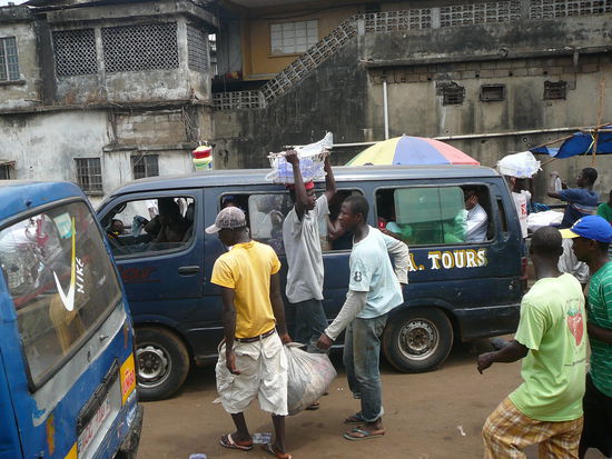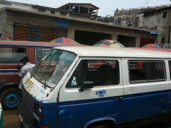 Die Organisation des öffentlichen Nahverkehrs in Freetown ist undurchschaubar und einfach zugleich. Man stellt sich an den Straßenrand und hält ein Fahrzeug an ! Das ist in meinem Falle in den seltensten Fällen einer jener Minibusse, die man überall in Afrika findet, Minivans, die feststehende Routen befahren, vollgepfercht mit Fahrgästen. Ein Boy hängt halb aus der Tür raus, schreit im Vorbeifahren das Fahrziel und rekrutiert die Kunden. Diese Minibusse heißen hier "Poda-Podas".