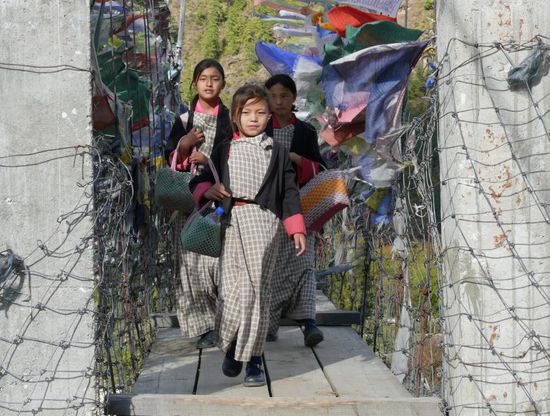 Paro liegt auf 2300 m. Wir checkten in unserem Hotel für 2 Nächte ein, welches uns sehr an eine Skihütte erinnerte, machten ein Nickerchen und schauten uns dann noch im Paro Tal zwei Sehenswürdigkeiten an. Manchmal erweckte es den Eindruck, man sei in der Schweiz - alles so sauber, die Luft so klar, nur die Häuser und die Menschen in ihren Trachten so anders. Aber allein schon die Brücken über den kleinen Fluss, der durch das Tal schießt, bringen einen in eine andere Welt.