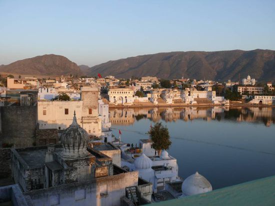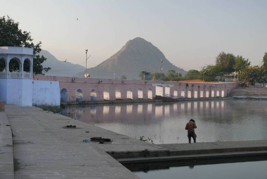 Pushkar ist eine Pilgerstadt am Rande der Wüste, mittendrin ist ein heiliger See, umgeben von Ghats, wo die Pilger ihr rituelles Bad nehmen. Ghandis Asche wurde hier in den See gestreut.