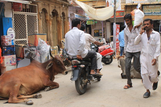 Waehrend den 10 Tagen, die wir in Jaisalmer verbracht haben ,hat es 7 Tage komplett durchgeregnet. Angeblich hat es in den letzten Jahren nicht mehr so viel geregnet wie in dieser einen Woche, worueber sich die Wuestenbewohner_innen sehr und wir dagegen eher weniger gefreut haben. Wegen des starken Regens hatten wir oft stundenlang keine Elektrizitaet, da die Leitungen aus Sicherheitsgruenden in der ganzen Stadt ausgeschaltet wurden. Weil wegen dem Monsun nur so wenige Tourist_innen in Jaisalmer waren, haben wir in den Tagen vor allem beobachtet, wie extrem der Wettbewerb zwischen den unzaehligen Hostels innerhalb des Forts ist (diesen Wettbewerb gibt es eigentlich in allen Touri-Orten in Rajasthan). Die Hostelbesitzer kontrollieren und spionieren sich gegenseitig aus, um zu sehen wer wie viele Gaeste hat und was sich jeweils in den Hostels veraendert hat. Ausserdem gibt es eine Vielzahl an Jungs, die auf der Strasse stehen und deren Job es ist Tourist_innen in bestimmte Cafes oder Hostels zu bringen, wo sie dann eine Kommission erhalten. Aufgrund dieser Jungs war es oftmals unglaublich anstrengend durch die Strassen von Jaisalmer zu laufen, weil man einfach immer angesprochen (meistens mit „̢Ca va“ oder „Bonjour“ da es offenbar viele franzoesische Tourist_innen in Jaisalmer gibt) und zugelabert wurde.
