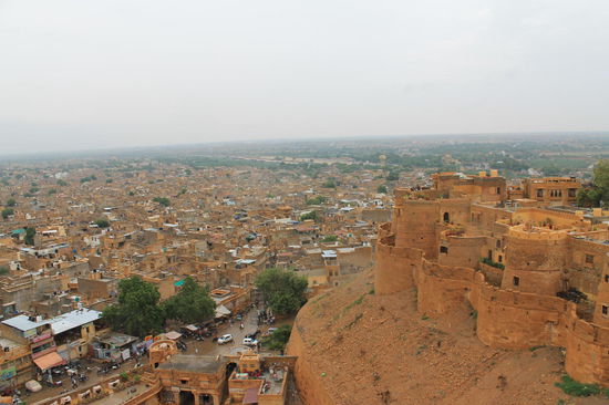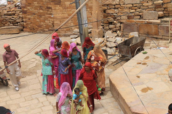 In Jaisalmer hat uns dann Ba, unser Chef fuer die naechsten 10 Tage, am Bahnhof abgeholt, wo unzaehlige Maenner gewartet haben, die alle versucht haben Tourist_innen fuer bestimmte Hostels zu gewinnen, wo ihnen dann eine Kommission gezahlt wird. Jaisalmer liegt in der Tharwueste in der Naehe zur pakistanischen Grenze und ist das einzige Fort in ganz Indien, das noch bewohnt wird, wobei die meisten Haeuser innerhalb des Forts mittlerweile Hostels oder Hotels sind und nicht mehr von Inder_innen bewohnt werden. Da alle Haeuser und Tempel aus Sandstein bestehen wird Jaisalmer auch als goldene Stadt in Rajasthan bezeichnet.