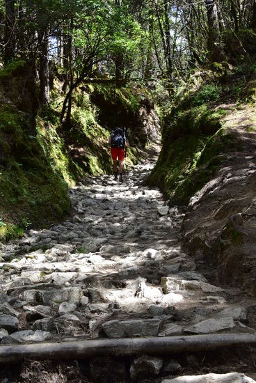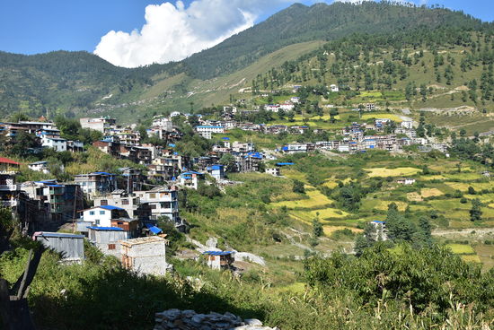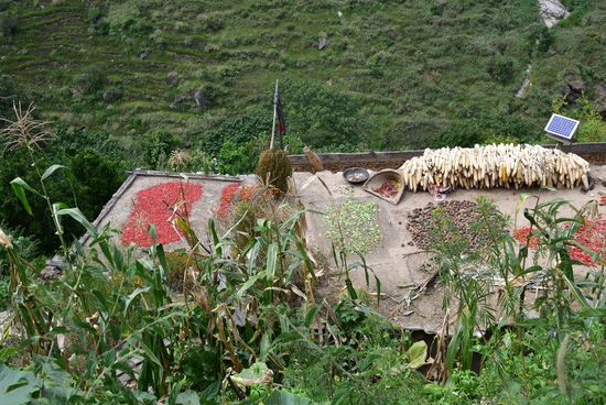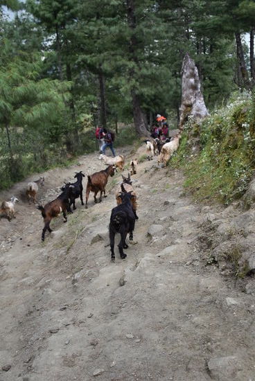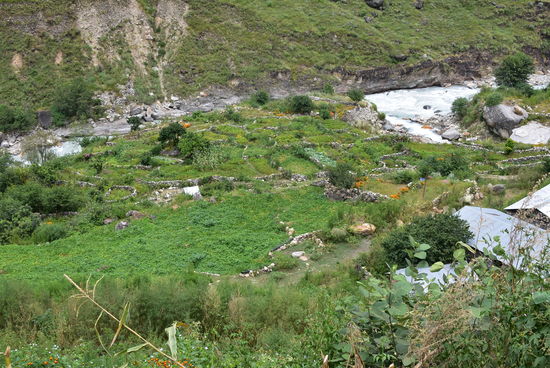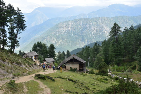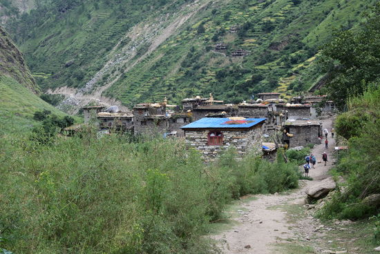 Heute stand der erste "richtige" Trekkingtag an. Da wir noch nicht sehr hoch waren, wurde es um die Mittagszeit ganz schön warm. Ansonsten war der Weg das ganz normale "Nepali Flat". Obwohl die Route sehr selten begangen wird, war zur gleichen Zeit eine Gruppe Australier unterwegs. Diese hatten im Gegensatz zu uns nur Tragtiere dabei. Wir haben uns sowohl in der Mittagspause als auch beim abendlichen Lager wiedergetroffen. Nachdem es am Abend vorher nach dem Beziehen der Zelte geregnet hat, hat uns der Regen heute auf dem Weg zum Lagerplatz erwischt. Da ich eh schon komplett verschwitzt war, habe ich mir die Regenjacke und -hose gespart. Bis unsere Träge mit dem Zelt da waren, haben wir uns in der "örtlichen Kneipe" ein Bier gegönnt und ich habe mich so nah wie möglich ans Feuer gesetzt, um etwas zu trocknen. Die Reste des Monsuns sollten uns auch in den nächsten Tagen pünktlich zum Nachmittag begleiten.