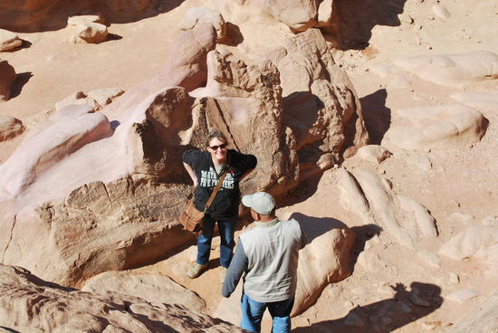 Das ist das Lawrence-of-Arabia-Ding... Hat er hier die "sieben Säulen der Weisheit" geschrieben ? Die Flecken in meinem Gesicht sind übrigens Beduinen-Schminke. H. hat im Moon Valley Hand angelegt, verschiedenfarbige Steine pulverisiert und sie mir ins Gesicht geschmiert. Damit lebe ich jetzt für den Rest des Tages, fast..