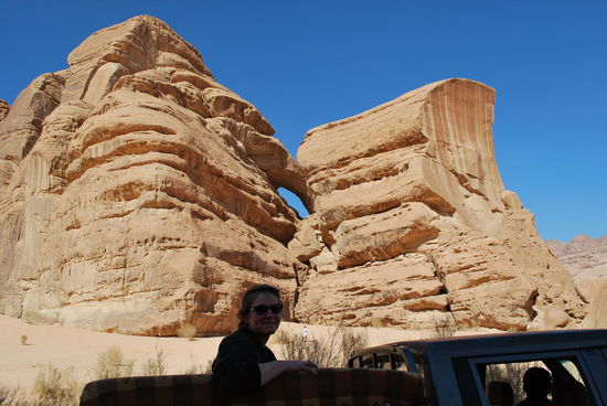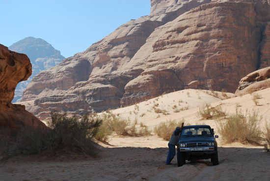 An der Tanke wartet unser Guide für Wadi Rum. Das Touri-Business ist auch hier fest in der Hand der Beduinen. Der Hyundai wird geparkt, ich nehme alles an Geraffel mit, was ich zu brauchen meine und steige auf die Ladefläche des 4x4-Toyota-Pick-ups, ein bereits etwas ramponiertes Vehikel, aber es tut seinen Job. Hier kommt H. mit, weil - was soll er sonst machen ??? Hier gibt´s nichts. Nichts, ausser einer absolut atemberaubenden Landschaft, und das ist einiges ! Wadi Rum ist 100 x 60 KM groß, lag früher an einer Karawanenroute und ist berühmt für Lawrence of Arabia, der Film wurde natürlich auch hier gedreht. Wadi Rum ist ausserdem Weltnaturerbe-Stätte der UNESCO.