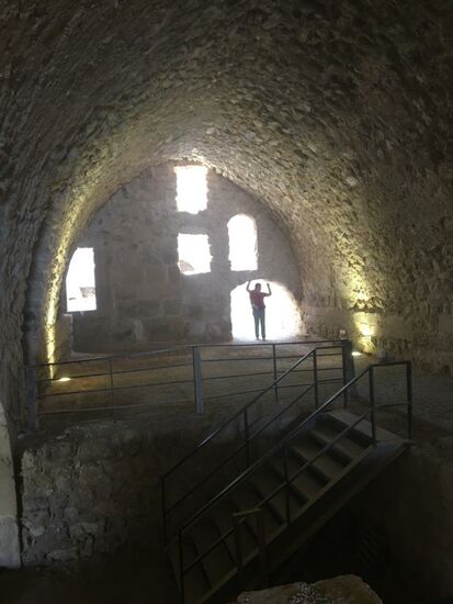 Die Küche der Burg mit Mühlsteinen—evtl um Olivenöl zu erzeugen—so erklärt einer der deutschen Guides..