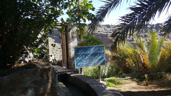 Der Eingang von Misfah. Es ist einer der schönsten Bergoasen Omans—hier am Eingang wird auf züchtige Kleidung für die Frauen hingewiesen.