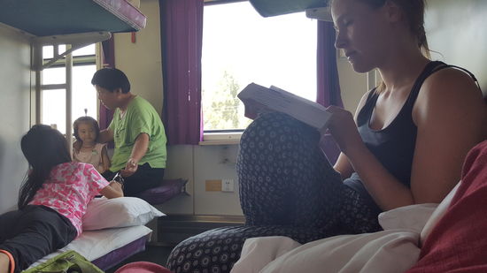 Thalia hat ein "Upper bed" mit einer lauten Männerbande, ich nebenan mit einer Familie, dessen ca 10-12 jähriger Sohn am Handy spielt und dabei Selbstgespräche führt.