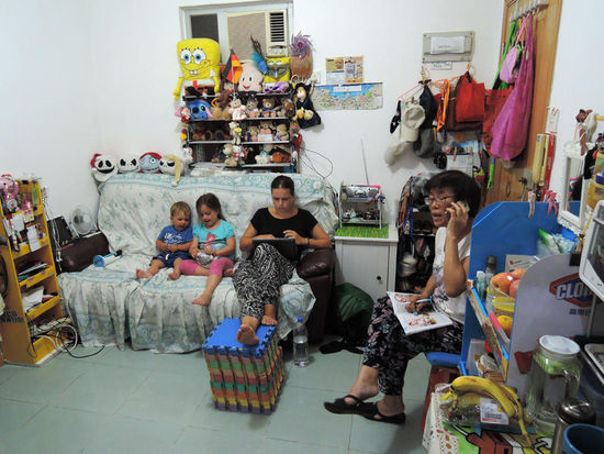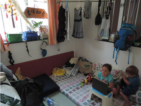 Noch bevor wir den Klingelknopf drücken konnten, ging schon die Tür auf und eine freundliche Frau, mittleren Alters strahlte uns an und begrüßte uns sehr herzlich. Sie hat zwei erwachsene Töchter, wobei eine in Deutschland lebt. Sue reist gern und viel - nur im Sommer ist sie in Hongkong und beherbergt kostenfrei Reisende aus der ganzen Welt. Sie antwortete einige Tage vorher direkt auf unsere Anfrage bei Couchsurfing.com und lud uns für 3 Nächte in ihre Wohnung ein. Wir waren sehr überrascht, da sie laut ihrem Profil nur einen Übernachtungsgast aufnimmt. Hat sie überhaupt genug Platz für eine Familie? Wo werden wir wohl schlafen? Im Wohnzimmer? Oder haben wir ein eigenes Zimmer? Fragen über Fragen. Als wir durch die Wohnungstür traten, standen wir mitten drin in ihrem kleinen, bunten Wohnzimmer. Alle 4 bzw. 5. Küche, Bad und zwei Schlafzimmer waren von hier aus begehbar, meist offen. Alles zusammen ca. 35 qm². Eine ganz neue Herausforderung. Für alle. Denn wir waren die erste Familie, die Sue aufnahm.