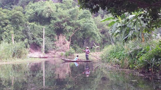 Die Bootsfahrt ist gemütlich. Langsam ziehen zuerst die Reisfelder an uns vorbei, bevor wir in die "Schlucht" kommen. Bananen, Papaya-Bäume, und Schilfgewächse.