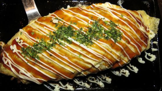 oder dieses, um eine Portion Nudeln gewickeltes Omelette.