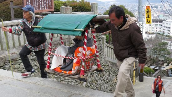 das hier schon seit über 30 Jahre zufriedene Kunde betreut. Frisch gestärkt machen wir uns an die Erkundung von Konpira-san, einem knapp 1.400 Stufen höher gelegenen Tempel der Seefahrer. Zum Vergleich: auf den Stefans-Dom in Wien sind es knapp 400 Stufen, auf das Ulmer Münster knappe 900, wobei hier zahlungskräftige KundenInnen sich die ersten 500 sehr steilen Stufen gegen ca. 10.000 JPY auch tragen lassen können.