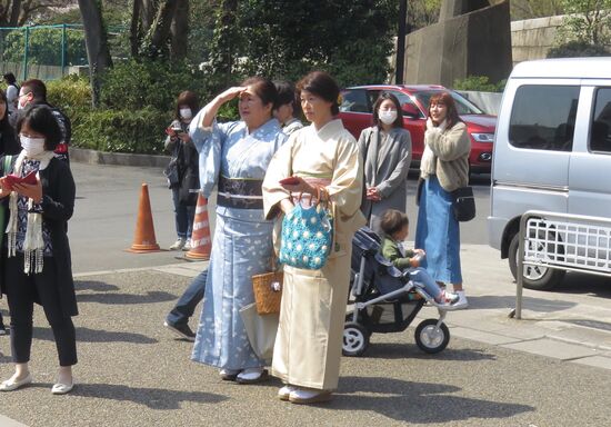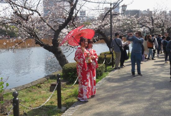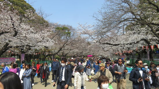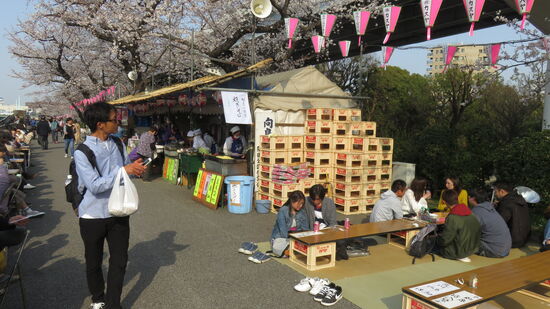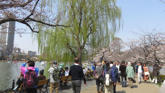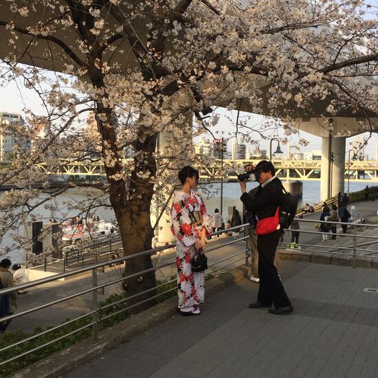 Dass die Kirschblütenzeit in Japan ein besondere ist, war uns bereits bekannt. Dass aber die Kirschblüten (sakura) und vor allem das Betrachten und Bestaunen der Blüten (hanami) knapp zwei Wochen lang die japanische Gesellschaft in einen „Ausnahmezustand“ versetzt, das hatten wir uns nicht träumen lassen. Denn immerhin gibt es die Kirschblüte jedes Jahr. Aber wie wir jedes Jahr gern Ostern zum Frühlingsanfang mit viel Sonnen und erstem Grün feiern, so steht hier die Kirschblütenzeit ebenfalls für den Aufbruch in die warme Zeit, für den Beginn der Blüte und ihrer Schönheit. Der Kirschbaum ist die offizielle Pflanze, zumindest in Tokyo. Mehr als die Hälfte aller Laubbäume im Land sind Kirschbäume. Und so sind Kirschbäume und deren Blüten auch überall in Tokyo zu finden. Jedes Wohngebiet, so scheint es, schmückt sich mit einigen Kirschbäumen. In unserem Bezirk gibt es eine richtige Allee von Kirschbäumen, deren Knospen bereits ganz prall waren, als wir in Tokyo ankamen. Aufgrund der warmen Temperaturen stehen die Kirschbäume nun fast überall im Stadtgebiet in schönster Pracht und verwandelt es in ein Blütenmeer von zartrosa bis Schneeweiß. Doch das richtige Bestaunen und Fotografieren findet in den sog. Kirschblütenhotspots statt. Am kleinen Meguro-Bach in unserem Stadtbezirk, entlang des Sumida River, dem Hauptstadtfluss oder im Ueno-Park, wo neben Weiden und Zypressen rund 800 Hundert Kirschbäume stehen. Der Ueno-Park liegt im Osten der Stadt und gehört zu den ältesten und bekanntesten Stadtparks der Stadt. Neben dem Zoo gibt es hier eine herrliche Seenlandschaft mit Lotus und Schilf sowie Weiden an den Ufern und eben vielen Kirschblüten. Und hier wird die Kirschblütenzeit regelrecht zelebriert mit vielen Imbissständen, Sekt- , Bier- und Sakeverkauf. Gern wird auch der traditionelle Kimono von den Frauen, jung wie alt, für das Betrachten und vor allen für das Ablichten vor den Kirschblüten gewählt.
