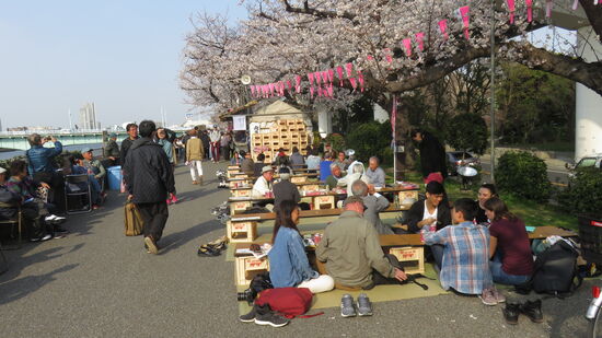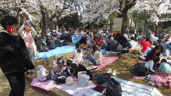 Bereits in alter Vorzeit sollen die Menschen sich an den Kirschblüten erfreut haben bei Essen und Trinken. Diese Tradition, so wird uns erzählt, soll bis heute andauern. Sofern man es einrichten kann, wird in Familie, mit Freunden oder Kollegen ein Hanami Picknick zumeist auf blauen Plastikfolien organisiert. Für die besten „Plätze“ muss man sich lange anmelden. Himmel und Menschen sind unterwegs, um ja nicht die Zeit zu verpassen. Auch wir bekamen diesen Andrang zu spüren. Wir hatten uns auf Empfehlung von Flori für die Kirschblüten am Fuße des Fuji-Berges entschieden, doch mussten zunächst erfolglos abtreten, weil alle Busse ausgebucht waren. Es am Folgetag konnten wir losfahren.