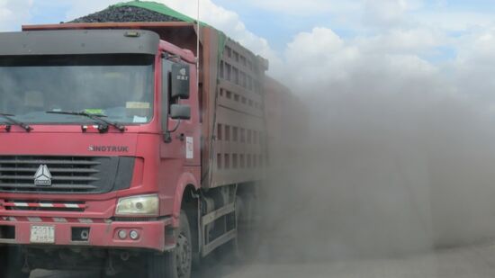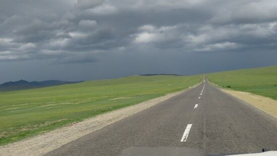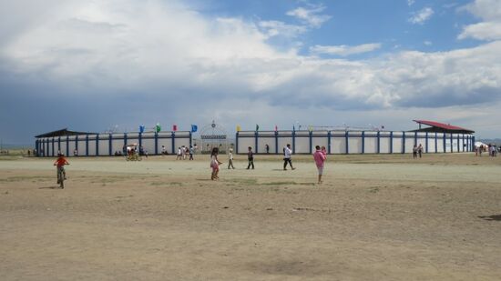 Für den restlichen Weg könnte man eigentlich eine neu gebauten Strasse benutzen, die jedoch nichts anderes ist, als lastwagenweise grober Schotter in der Gegend verteilt, kaum gewalzt und die weiterer Verfestigung dem Verkehr überlassen. Das Fahren auf dieser ruppigen schlaglochübersäten Slalomstrecke macht offensichtlich nicht nur uns keinen Spass, eigentlich jeder benutzt die mehr oder weniger parallel hierzu verlaufenden alten Sandpisten im Grasland. Gegen Mittag erreichen wir Chinggis Khot und freuen uns über die gut zugeparkten Strassen rings um die Ringkampf Arena (Wrestling Stadion).