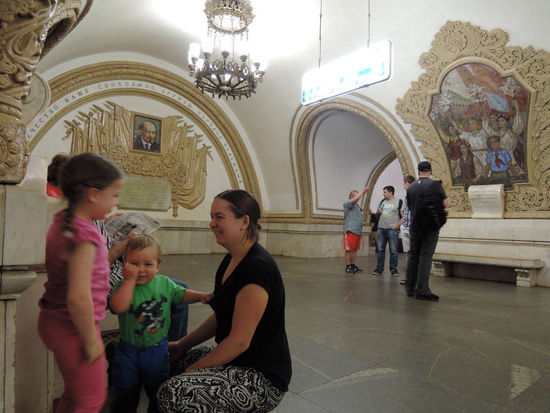 Unser erster Eindruck von Moskau war durchweg positiv. Die Passkontrolle am Flughafen dauerte zwar etwas länger als in anderen Ländern, aber wir hatten ja Zeit. Da wir Low-Budget reisen, kam eine Taxifahrt zu unserer Unterkunft für uns nicht in Frage. Vom Flughafen fährt ein Zug direkt ins Zentrum von Moskau und den wollten wir nehmen. Der Fahrkartenkauf war problemlos auf englisch am Automaten möglich. Tickets für 4 Personen kosteten uns insgesamt ca. 30 €. Im Zug erfuhren wir, dass es auch ein Familienticket für die Hälfte des Geldes gibt. Das wollten wir uns für die nächste Fahrt (mit der U-Bahn, die uns direkt zu unserer Unterkunft bringt) ersparen und kauften die Fahrkarten an der Kasse. Super. Mit unseren günstigen Tickets in der Hand begaben wir uns auf direktem Weg in die Rush-Hour von Moskau. Dumm gelaufen. Mit Massen an Menschen quetschen wir uns mit unseren riesigen Rucksäcken, 3x Handgepäck und Kindern auf dem Arm die enorm langen Rolltreppen zur U-Bahn hinunter. Und wieder rauf. Und wieder runter. Es dauerte, bis wir die richtige Linie gefunden hatte. Für mich standen dort überall nur Hieroglyphen - für Mirko, halbwegs lesbare Worte. Wir drängten uns also in die übervolle U-Bahn, konnten uns keinen Millimeter bewegen und zählten aufgeregt die Haltestellen mit. Blöd nur, dass wir aus der Bahn heraus keinen Haltestellen-Name erkennen konnten. So fuhren wir erstmal in die falsche Richtung. Dann wieder zurück. Dann wieder zwei Haltestellen zu weit. Also wieder zurück. Irgendwann kamen wieder übermüdet und mit einem hungrigen Willi - alle die ihn kennen, wissen was das bedeutet , endlich an der richtigen Station an.