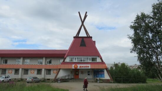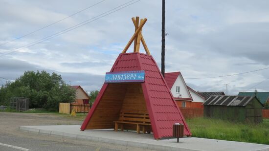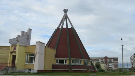 Das Innere der Kola Halbinsel, macht auf uns irgendwie einen gespenstischen Eindruck, durch die Bäume am Strassenrand kann man in der Entfernung Minen, riesige Abraumhalden und teils sehr modern wirkende Industrieanlagen mit angrenzenden Wohnkomplexen erkennen, aber nirgendwo ist eine Zufahrt dahin zu finden, alles wirkt irgendwie versteckt, geheimnisvoll. Nach 80km erreichen wir Lovozero, allein drei Gebäude in Form eines Tipi wie dieses Hotel mit Supermarket,