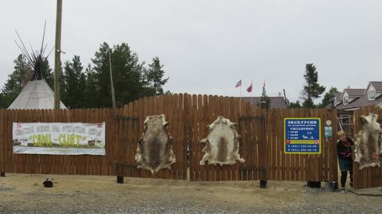 weisen darauf hin, dass in dem Dorf mit 2.000 Ew., etwa die Hälfte davon Samen sein sollen. Der Rest des Ortes wirkt auf uns eher heruntergekommen, verfallen. An einer Nebenstrasse nach Murmansk das mit riesigen Tafeln am Strassenrand heftig beworbene Sami Tourist Village, ein paar Gebäude hinter einem verschlossenen Bretterzaun, wir dürfen warum auch immer die Anlage nur von aussen fotografieren,