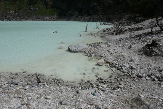 Der See riecht stark nach Schwefel, an einer Stelle ist ein Schild, dass man sich nicht länger als 15 min hier aufhalten soll. Das unnatürlich türkise Wasser ist sehr sauer (ph-Werte von 0,5 - 1,3).