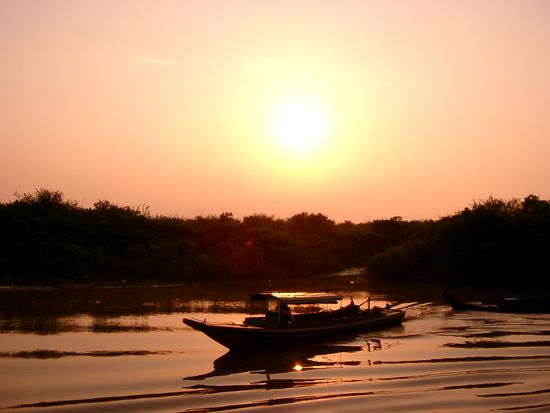 Kambodscha ist ein zumindest zu großen Teilen sehr wasser- und fischreiches Land. Zwischen Angkor und Phnom Penh spannt sich auf 150 Kilometern Länge der Tonlé Sap-See auf, der seine Größe jedoch über das Jahr hin drastisch ändert und zur Regenzeit große Flächen mit fruchtbarem Schlamm überschwemmt. Der See selbst ist mit Phnom Penh über einen 100 km langen Abfluss verbunden, der in der Hauptstadt mit dem Mekong zusammenfließt. Jedes Jahr im Mai, während der Regenzeit, wenn der Pegel des Mekong drastisch angestiegen ist, dreht sich die Flussrichtung dieser Verbindung und Unmengen Wasser aus dem Mekong strömen in den See. Der Fischreichtum ist angeblich von biblischem Ausmaß und wirklich: Während der gesamten Fahrt springen uns regelmäßig 150-kg-Karpfen ins Boot.