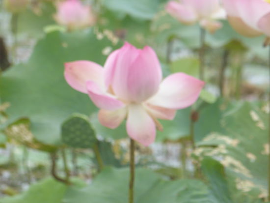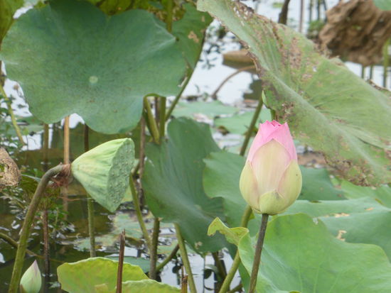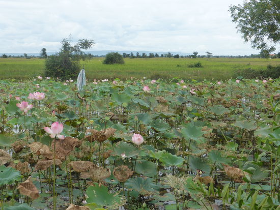 Auf der Rückfahrt halten wir dann kurz an einem Lotusfeld, das am Straßenrand liegt. Die Landschaft hat etwas Heidecharakter – eben und mit einzelnen Bäume durchsetzt.
