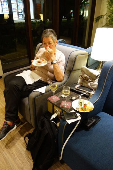 Gegen 17.00 Uhr erreichen wir den Flughafen und nach Einchecken und Sicherheitskontrolle können wir uns bei angenehmer Temperatur in der Vip-Lounge versorgen. Hier hätte man zur Not auch noch duschen können. 2x GinTonic und ein paar Snacks mit einem Glas Wein und danach noch einen Kaffee.