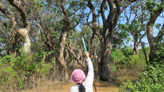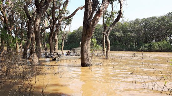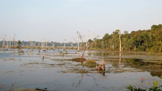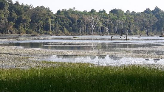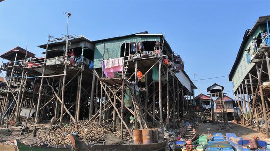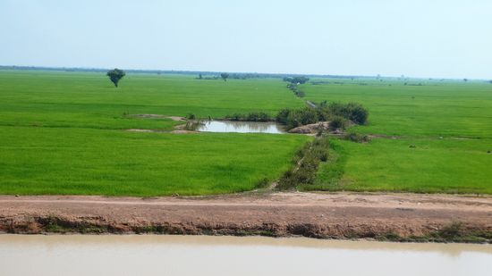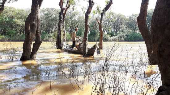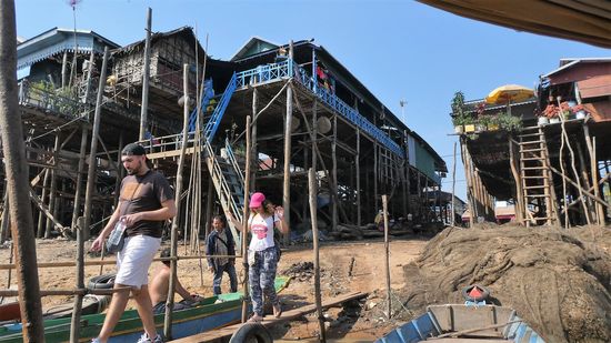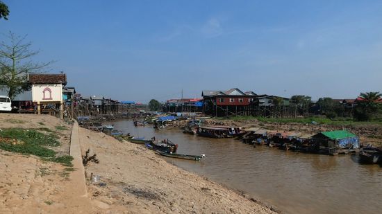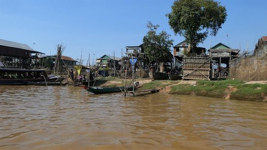 Jetzt ist Trockenzeit und der Wasserstand niedrig, Ein Fluß, der zur Trockenzeit Richtung Mekong fließt aus dem Tonle Sap See und zur Regenzeit fließt er in den See.