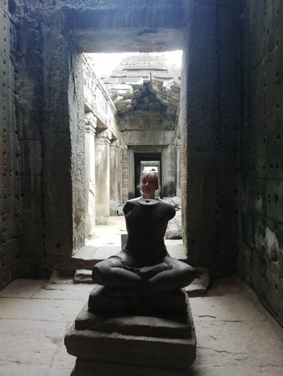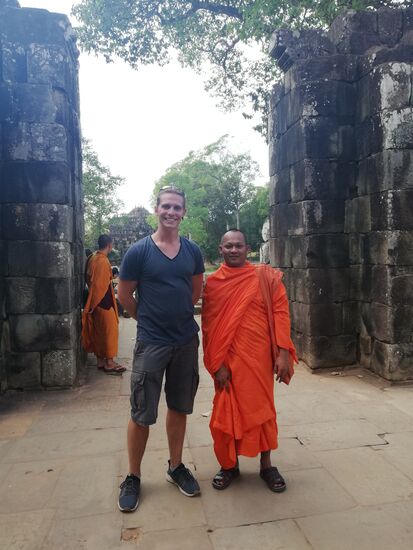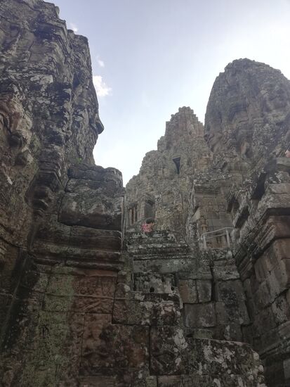 Tag eins führte uns zu den größten und berühmtesten Anlagen. Wir besuchten pro Tag etwa fünf Tempelruinen und waren selbst überrascht festzustellen, dass keine der anderen glich. Alle Anlagen hatten ihren ganz eigenen Charakter. Mal waren sie besonders hoch, mal besonders bewachsen, mal aus rotem Stein und mal mit unzähligen Gesichtern verziert. Ein Tempel war ursprünglich hinduistischen Gottheiten gewidmet, wurde dann allerdings unter buddhistischer Herrschaft umgeweiht. Dafür wurde die gigantische Mauer, welche den Tempel umgibt, in die Form eines liegenden Buddhas gemeißelt. Überall sind solche Unikate zu finden, was den Besuch nie langweilig werden lässt.