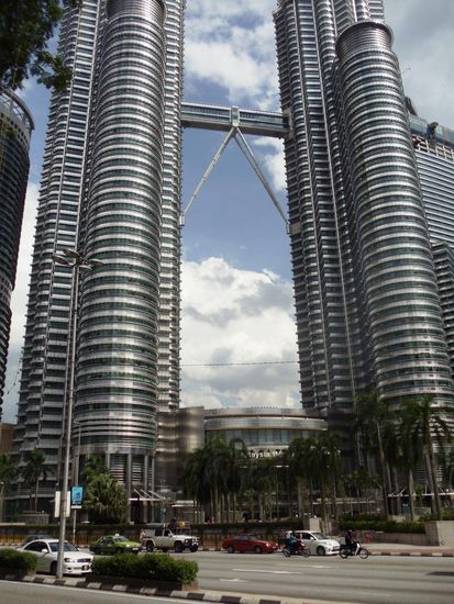 Wir fahren, nachdem wir die Insel Penang wieder ueber die Bruecke verlassen haben, direkt auf die Autobahn. Das Autofahren in Malaysia wird einem sehr leicht gemacht. Obwohl wir auch hier wieder auf der fuer uns ungewohnten linken Seite fahren muessen, haben wir keine Probleme. Die Strassen sind sehr schoen und Beschilderung ist grossartig. Wir entscheiden uns fuer die Autobahn, weil der Verkehr auf den Nebenstrassen sehr dicht ist und es alle hundert Meter eine Ampelanlage hat. Die Autobahnen sind zum Teil sogar sechs Spurig und man darf 110 Stundenkilometer schnell fahren. So brauchen wir fuer die 350 Kilometer nach Kuala Lumpur keine vier Stunden. Auf dem Plan sehen wir, dass die Botschaft von Australien in unmittelbarer Nähe der Petronas Twin-Towers ist. Schon von weitem, immer noch auf der Autobahn, sehen wir die markanten Zwillingstuerme und den ebenfalls sehr imposanten Fernsehturm. Wir fahren also mitten in die Stadt und orientieren uns immer an den Twin-Towers. Wir finden auf Anhieb die Botschaft, welche leider aber nur am Morgen geoeffnet hat. Wir muessen demnach am Dienstag die Botschaft aufsuchen.