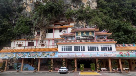 Wir erreichen Ipoh, die drittgrösste Stadt in Malaysia. In den umliegenden Karstbergen hat das hier so reichhaltige Wasser Grotten und Höhlen ausgewaschen, in die Buddhistische Mönche dann ihre Tempel gebaut haben – und genau die sind der Schwerpunkt des heutigen Tages. Der Berg, der die Perak Cave beinhaltet, macht den Eindruck eines hohlen Zahnes, eine riesige Grotte mit einem Ausgang nach oben – eine eingestürzte Doline? wurde von aussen mit einem Tempelgebäude zugebaut,