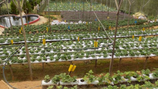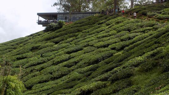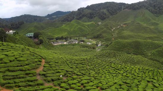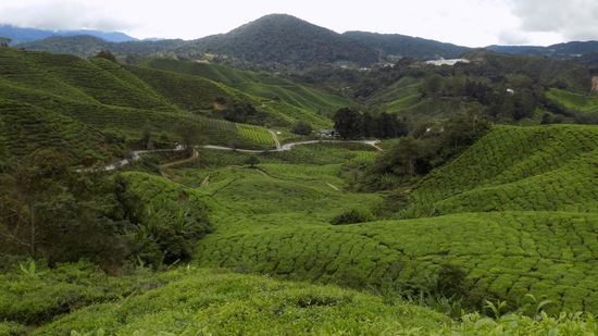 Hier dürfen sich die Touristen für MR 6 über die Kunst des Lavendelanbaus informieren und dazuhin noch fleissig einkaufen. Wir sind auf 1500m Höhe im grössten Urlaubsgebiet Malaysias. Das Klima ist angenehm kühl, die Luftfeuchtigkeit hoch, der Niederschlag reichlich, ideal für Erdbeer- und vor allem Tee Plantagen,
