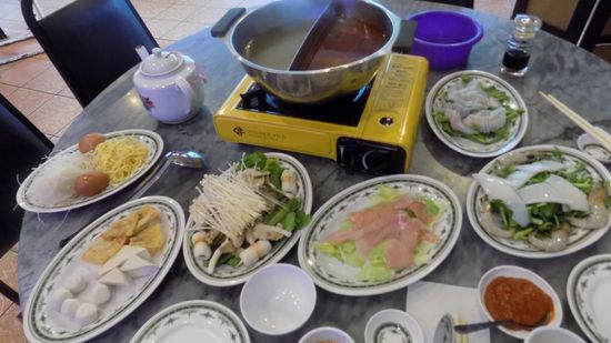 bevor wir uns zu einem Steam Boat (= Dampfer, = chinesisches Fondue) niederlassen