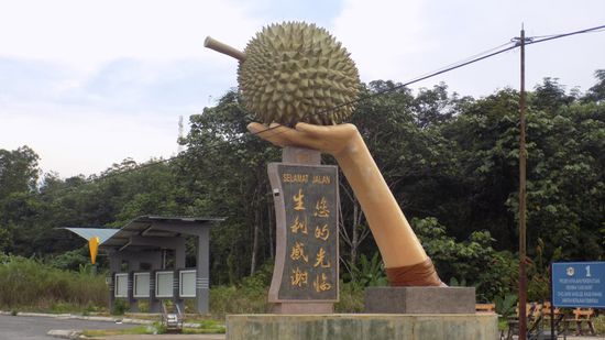 Auf der zweiten Einbahnstrasse geht es genauso schmal und steil wieder runter ins Tal, wo wir eines der grossen Obstanbaugebiete Malaysias durchqueren. Die hier wachsenden Durians, das sind diese Riesenfrüchte mit dem penetranten Geruch, können wir leider nur als Kunstwerk bewundern,