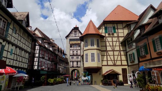 das Elefantenbad und die daran anschliessende Elefantenshow / -Fütterung haben wir uns für unseren nächsten Besuch hier aufgehoben, denn die findet immer Freitags ab 14:45 statt und gut drei Stunden rumsitzen und warten wollten wir nicht. Wir fahren nun Richtung Westen bis Bukit Tinggi und erreichen dort Colmar Tropical (E=MR 13 p.P.), ein ‚Resort‘ im französisch / japanischen Stil. Teile der Stadt Colmar (im Elsass) wurden im Disney Stil nachgebaut,