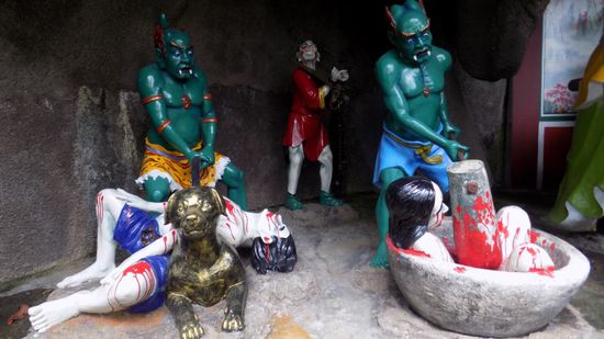 einer sehr anschaulich gestalteten Reihe von Szenenbildern, in denen erklärt wird, was in den 10 Höllen des Buddhismus mit ‚den bösen Buben‘ geschieht.