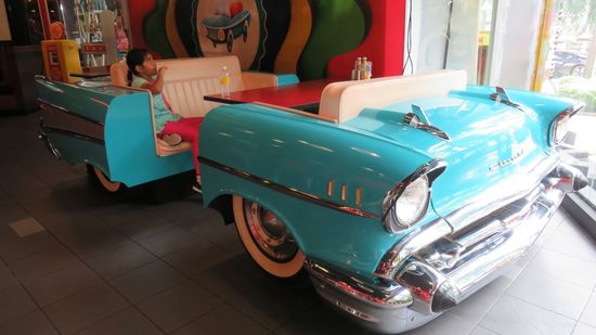 entdecken ein bisher von uns übersehenes Restaurant, in dem alte, zersägte Amerikanische Strassenkreuzer als Mobiliar dienen,