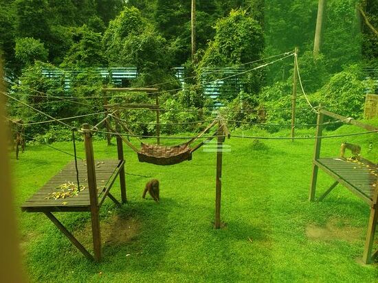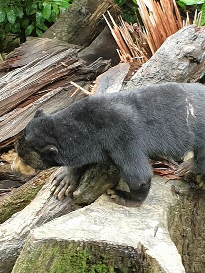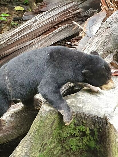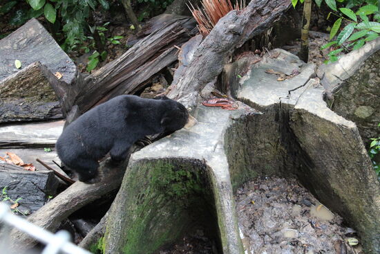 Wir besuchen ebenfalls noch die Malayenbären. Ebenfalls ganz nah – 2 m unter uns. Die Bären werden ohne den Kontakt mit den Menschen gehalten, damit sie anschließend wieder ausgewildert werden können. Sobald sie Kontakt zu Menschen aufbauen, ist das nicht mehr möglich.