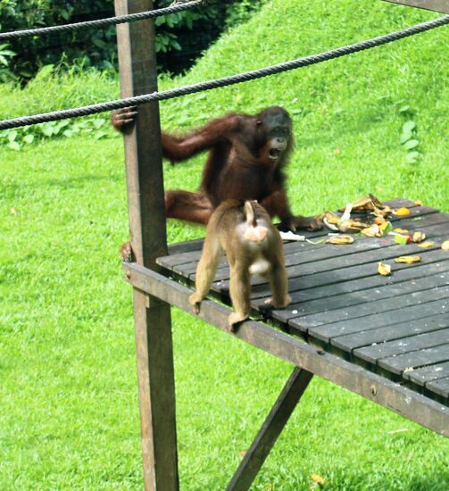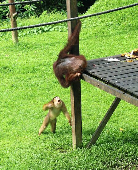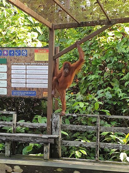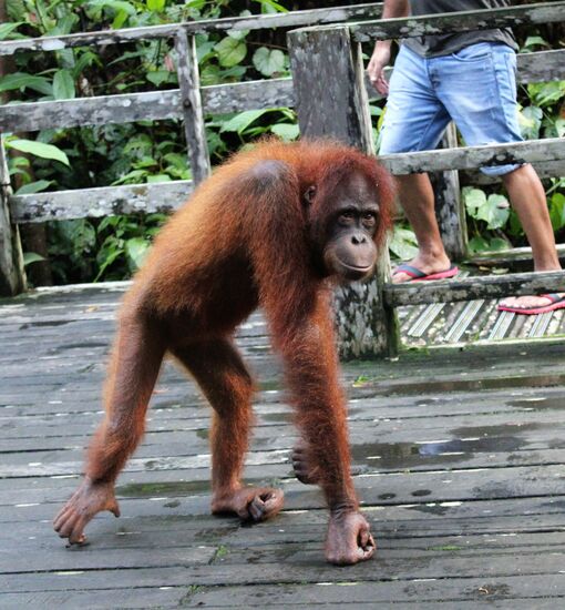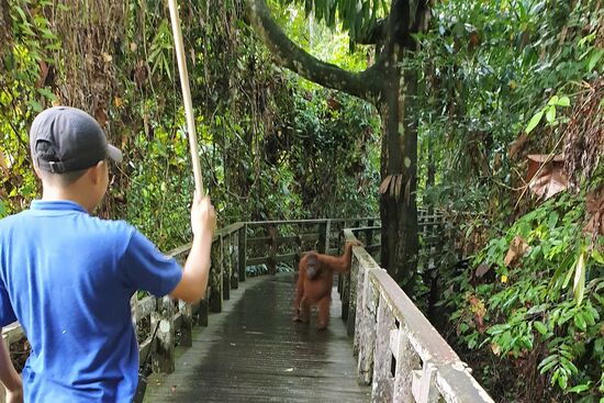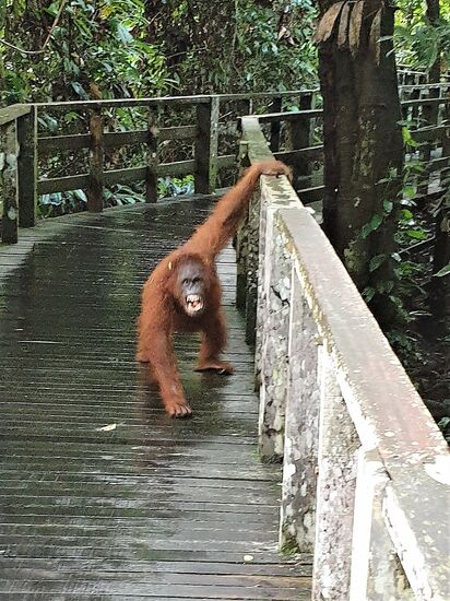 Auf dem Weg zur Fütterungsstation läuft ein Orang Utan auf dem Holzsteg. Ein Ranger läuft sofort mit, einen Stock bereit, um uns zu schützen. Gemütlich läuft der Affe vor uns her, dreht sich dann um und droht uns. Der Ranger droht mit Stock zurück, und nimmt seine Kappe ab. Ab da dreht sich der Orang Utan um und setzt dann einfach seinen Weg weiter fort. Der Ranger erzählt, dass der Affe ihn mit Kappe nicht als Freund identifiziert hat.
