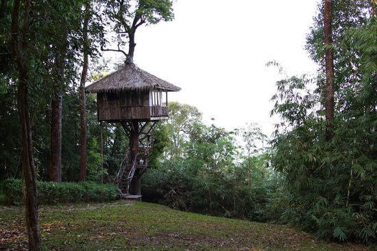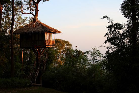 Das Baumhaus hatte einen super genialen Blick auf die Berge Richtung Myanmar. Bis dorthin waren es nur noch 8km. Das Baumhaus selber war sehr urig. Es hatte einen kleinen Balkon wo 2 Stühle drauf gepasst haben. Von unten hoch kam man durch eine Luke welche man nachts schließen konnte um keinen unerwarteten Besuch zu bekommen. Das Baumhaus selber bestand nur aus einem kleinen Raum 1,50mx2m und einem kleinen Bad. Das Bad war schon sehr abenteuerlich mit einer kleinen Handdusche.