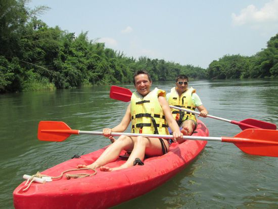 Unser Guide Jokee kam 30 min. zu spät, er entschädigte uns aber mit guten 4,5 Stunden obwohl wir nur 3 Stunden gebucht hatten. Wir fuhren mit dem Elektroauto runter zum Fluss, haben Schwimmwesten angezogen, kurze Hosen ausgezogen und ab aufs Kanu. Flussabwärts ist es keine Kunst, die Strömung ist nicht stark man kann sich einfach treiben lassen. Das ging dann 1/2 Stunde, dann stiegen wir an den Float-Häusern aus. Super schön, zwar ohne Strom, mit kaltem fließenden Wasser, wobei kalt relativ ist, weil irgendwie kommt das nicht wirklich kalt aus der Leitung. Dort haben wir uns ein Zimmer, bzw. Haus zeigen lassen, sehr romantisch und idyllisch, für eine Hochzeitsreise sehr geeignet. Diese Float-Häuser werden von den Mon-People bewirtschaftet.