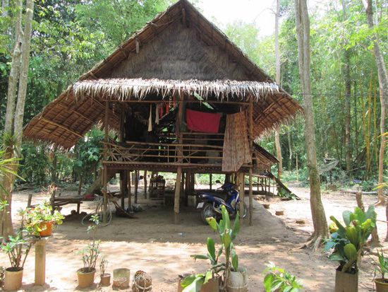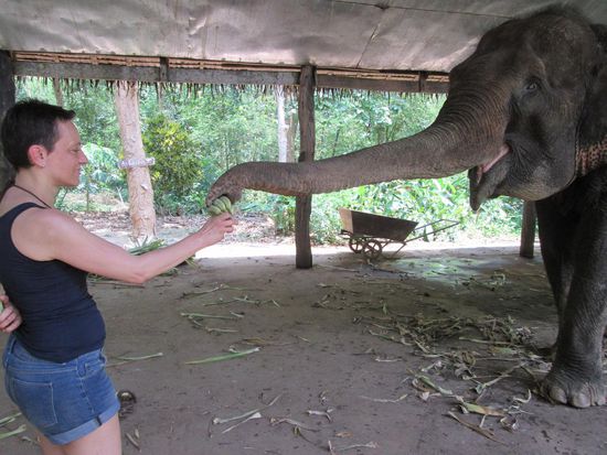 Runter vom Floß und rein in den Wald, gelangen wir ins Mon Village, wo die Mon People, ein ethnisches Volk, das aus Burma stammt und ein sehr viel kleineres Volk ist, als die Thailänder. Sie leben und kleiden sich nach alten Traditionen, haben in ihrem Dorf 2 Elefanten, die man für 20 Bt füttern kann, eine Lehrerin, eine Schule für 4-7 jährige, dort lernen diese Kinder alles gleichzeitig in 4 Sprachen, einen Sportplatz, einige Rinder und Hühner. Sie wohnen in Stelzenhäusern, weil es leicht sauber zu halten ist und es sie vor Kleintieren schützt. Danach wurden wir dann in einen Souvenir Shop geführt, wo einige Mon People anscheinend gerade das Mittagessen beendet hatten. Bernd bekam zum testen eine selbstgewickelte Zigarette und unserem Guide wurde ein Rest Suppe angeboten. Er probierte die Suppe mit einem Löffel aus dem Topf und dann wurde mir der Löffel hingehalten. Ich konnte nicht anders und habe sie dann auch probiert, lecker, nicht so scharf, wie ich erwartet hatte. Bernd musste dann auch noch, unser Kommentar hierzu: "Ok, wir sind ja geimpft!"