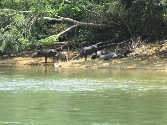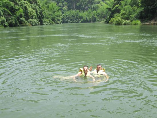 So jetzt wieder Schwimmwesten an und ab aufs Floß. Als wir in der Höhe der Büffel auf einer Flussseite waren, durften wir springen. Es war herrlich kühl, so ca. 25 Grad, also angenehmes treiben lassen. Nach ca. 10 min. haben wir uns, elegant wie Säugetiere, aus dem Wasser helfen lassen und haben dann Natur und Umgebung genossen. Sind an weiteren Float-Häusern vorbeigekommen, diese sind die edlere Ausstattung mit Klima und Strom. Auch super schön und idyllisch. Zum Mittagessen und Ende der Floßfahrt sind wir dann im Resotel abgestiegen. Das kam uns sehr gelegen, weil wir ja da ursprünglich unterkommen wollten, war aber ausgebucht. Wir hatten 1,5 Std. Zeit zum essen und relaxen an Pool oder River, wir haben uns für den River entschieden. Jokee kam wieder mal zu spät, na ja es gibt Schlimmeres.